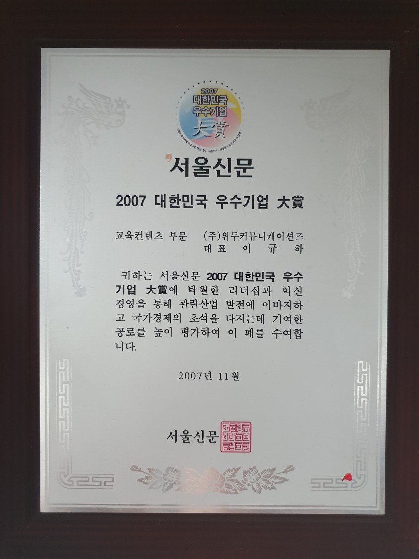 2007 대한민국 우수기업 대상 페이지 정보 작성자 WeDu 댓글 0건 조회 4,645회 작성일 19-05-30 19:31 본문 2007-11-00 대상 교육 콘텐츠 부문 2007 대한민국 우수기업 대상 서울신문 List Previous제 8회 디지털 이노베이션 대상 19.05.30