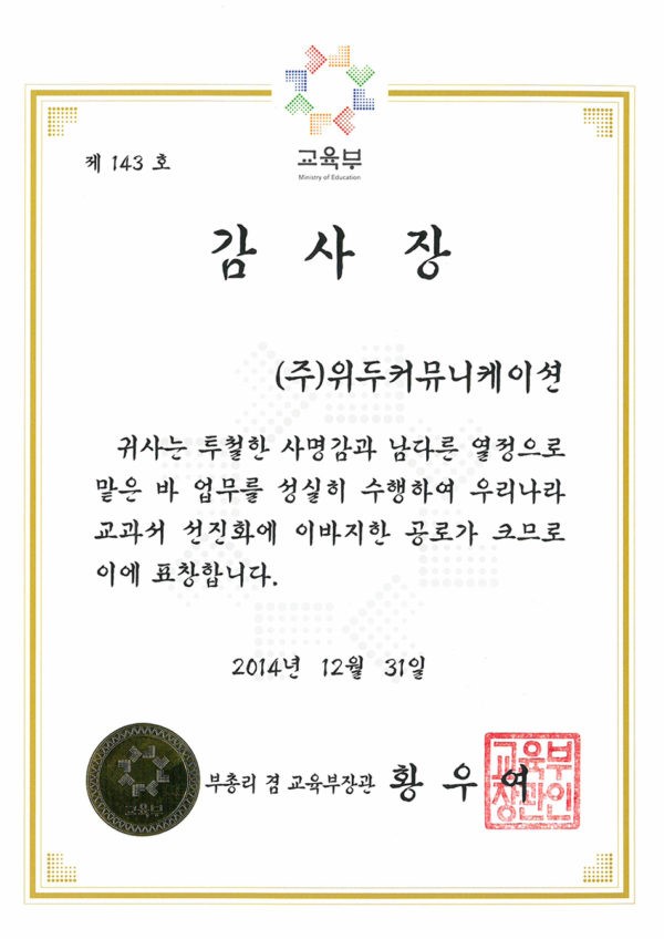 감사장 제 143호 페이지 정보 작성자 WeDu 댓글 0건 조회 5,073회 작성일 19-05-30 19:33 본문 2014-12-31 감사장 제 143호 교과서 선진화 부총리 겸 교육부장관 황우여 List Previous산업통상자원부 표창장 19.05.30 Next한국여성벤처협회 표창장 19.05.30