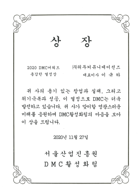 2020 서울산업진흥원 2020 DMC어워드 페이지 정보 작성자 WeDu 댓글 0건 조회 4,269회 작성일 21-12-31 12:57 본문 2020-11-27 2020 DMC어워드 용감한 열정상 서울산업진흥원 DMC활성화팀 List Previous2020 기술혁신 우수기업 21.12.31 Next2018 소년한국 우수 어린이 도서 19.05.30