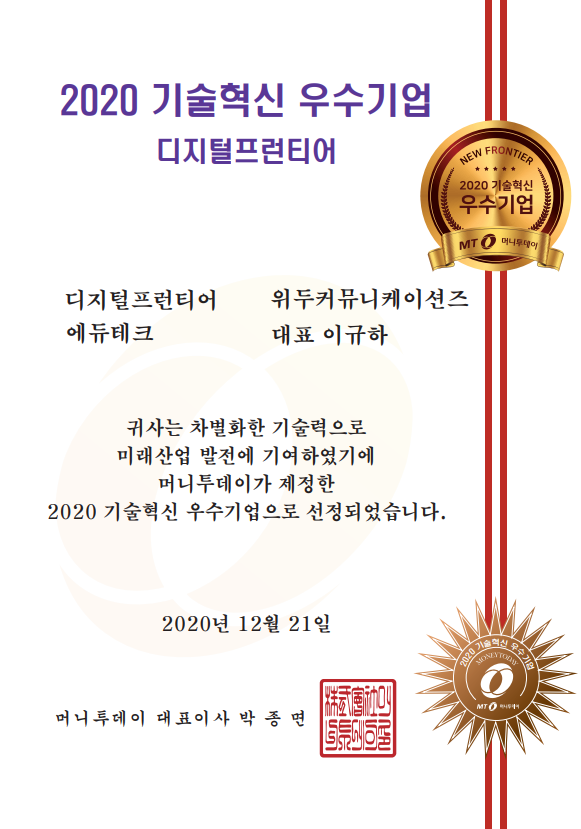 2020 기술혁신 우수기업 페이지 정보 작성자 WeDu 댓글 0건 조회 4,583회 작성일 21-12-31 12:58 본문 2020-12-21 2020 기술혁신 우수기업 디지털프런티어 에듀테크 머니투데이 대표이사 List Previous2020 소년한국 우수 어린이 도서 선정 21.12.31 Next2020 서울산업진흥원 2020 DMC어워드 21.12.31