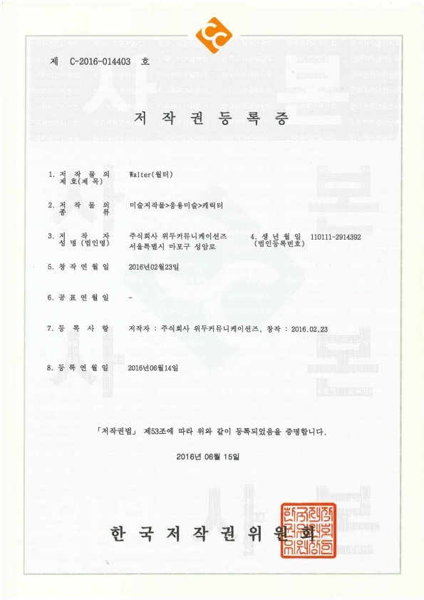 [한국/저작권] 월터 페이지 정보 작성자 WeDu 댓글 0건 조회 4,708회 작성일 19-05-30 19:09 본문 2016-06-15 저작권 C-2016-014403 월터 / 미술저작물>응용미술>캐릭터 List Previous[한국/저작권] 파벨 19.05.30 Next[한국/저작권] 필립 19.05.30