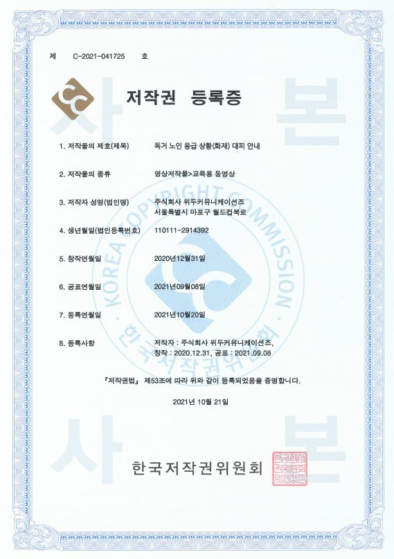 [한국/저작권] 독거 노인 응급 상황(화재) 대피 안내 페이지 정보 작성자 WeDu 댓글 0건 조회 4,857회 작성일 21-12-31 12:41 본문 2021-10-21 저작권 C-2021-041725 영상저작물>교육용 동영상 List Previous[한국/저작권] 장보기 인지훈련 게임 21.12.31 Next[한국/저작권] OLL KIDS/MATH 21.12.31