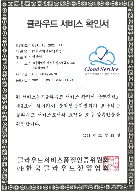 [한국/인증서] OLL KIDS/MATH 클라우드 서비스 확인서 페이지 정보 작성자 WeDu 댓글 0건 조회 7,536회 작성일 21-12-31 12:46 본문 2021-11-25 확인번호 CSA-18-2021-11 서비스명 : OLL KIDS/MATH List Previous[한국/확인서] OLL KIDS/MATH 파스-타 호환성 확인서 21.12.31 Next[한국/저작권] 장보기 인지훈련 게임 21.12.31