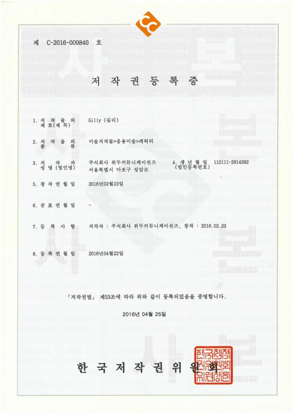 [한국/저작권] 길리 페이지 정보 작성자 WeDu 댓글 0건 조회 4,746회 작성일 19-05-30 19:07 본문 2016-04-22 저작권 C-2016-009840 길리 / 미술저작물>응용미술>캐릭터 List Previous[한국/저작권] 나무트 19.05.30 Next[한국/저작권] 리안의 수학 모험 19.05.30